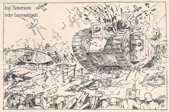 De eerste inzet van de Engelse Mark-tanks moest afschrikwekkend  overkomen tijdens de slag aan de Somme in 1916. Toch wisten de Duitsers al van in het begin hoe ze die moesten uitschakelen: namelijk van boven af bombarderen vanuit vliegtuigen. Getuige deze met toelating van de Duitse legerleiding massaal verspreide postkaarten die met dit “heugelijke nieuws” de troepen een hart onder de riem moesten steken. Veel tanks zijn zodoende uitgeschakeld (proefondervindelijk of door industriële spionage?) zodat die eerste inzet uiteindelijk een halve mislukking werd...