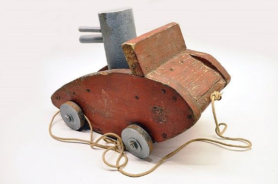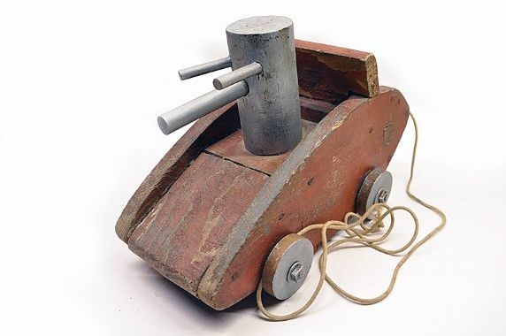 Hier wat uitleg over wat op de kaft van het boek (klik) dat mijn Lefla kreeg stond (een fotobewerking hoor hihi): een door vader-voor-zoon zelf-geknutselde houten modernistische “streamline” tank van de Interbellum-periode uit zijn collectie - met de nodige ouderdomsslijtage...