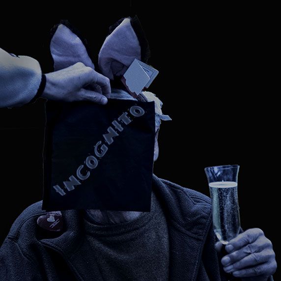 De incognito persoon is geheel in blauw gehuld. En laat dat nou mij favoriete kleur zijn. En als de persoon teveel drankjes nuttigt is de kans groot dat-ie ook nog echt blauw wordt ;-) Ik zie oren als van Mickey Mouse? Of ben ik nog niet helemaal wakker?