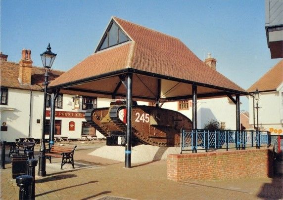 De bij-tank-dag van 18 oktober ll. in herinnering (zie aldaar klik) over de enkele tanks uit de Eerste Wereldoorlog destijds te bezichtigen in onze Westhoek (o.a. Poelkapelle): hier een Engels voorbeeld. Wie eens niet zo veraf een goed bewaarde en perfect gerestaureerde tank van de Mark-serie wil bewonderen als monument op het openbaar domein, kan dit doen middenin Ashford op 25km voorbij de uitrit van de ‘Chunnel’ van Folkestone, in volle winkelcentrum van de Highstreet, op enkele minuten gaans van het spoorwegstation en vlakbij de uitrit van de M20 richting Londen. In tegenstelling met deze postkaart is de basiskleur ondertussen wel ‘opgefrist’ van bruin naar kaki-groen. Dit is het enige exemplaar buiten museumcontext over het Kanaal (het Imperial War Museum te Londen en het Tankmuseum Bovington dus, of enkele Engelse privé-verzamelingen).
